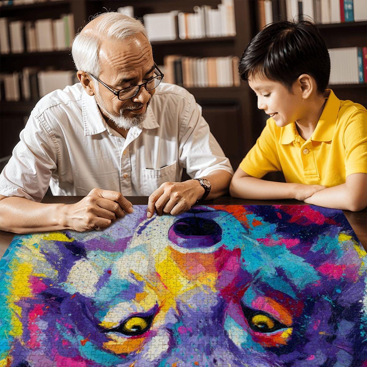Unleash the wild beauty of art with this striking Wooden Jigsaw Puzzle featuring a bold, abstract wolf painted in an explosion of vivid colors. This palette knife-style masterpiece transforms the majestic spirit of the wolf into a puzzle experience like no other.
