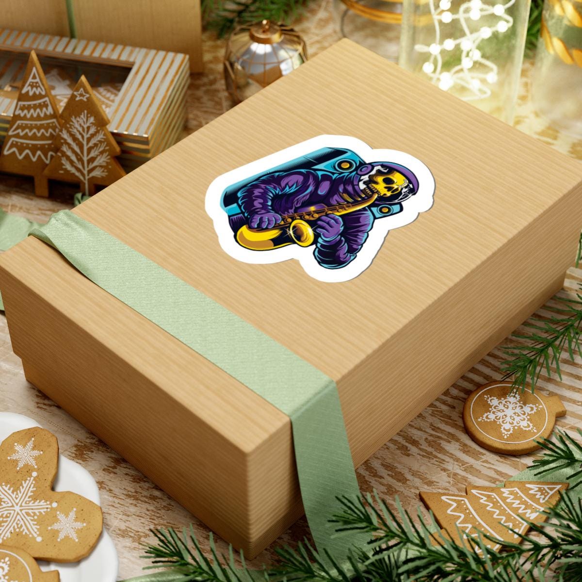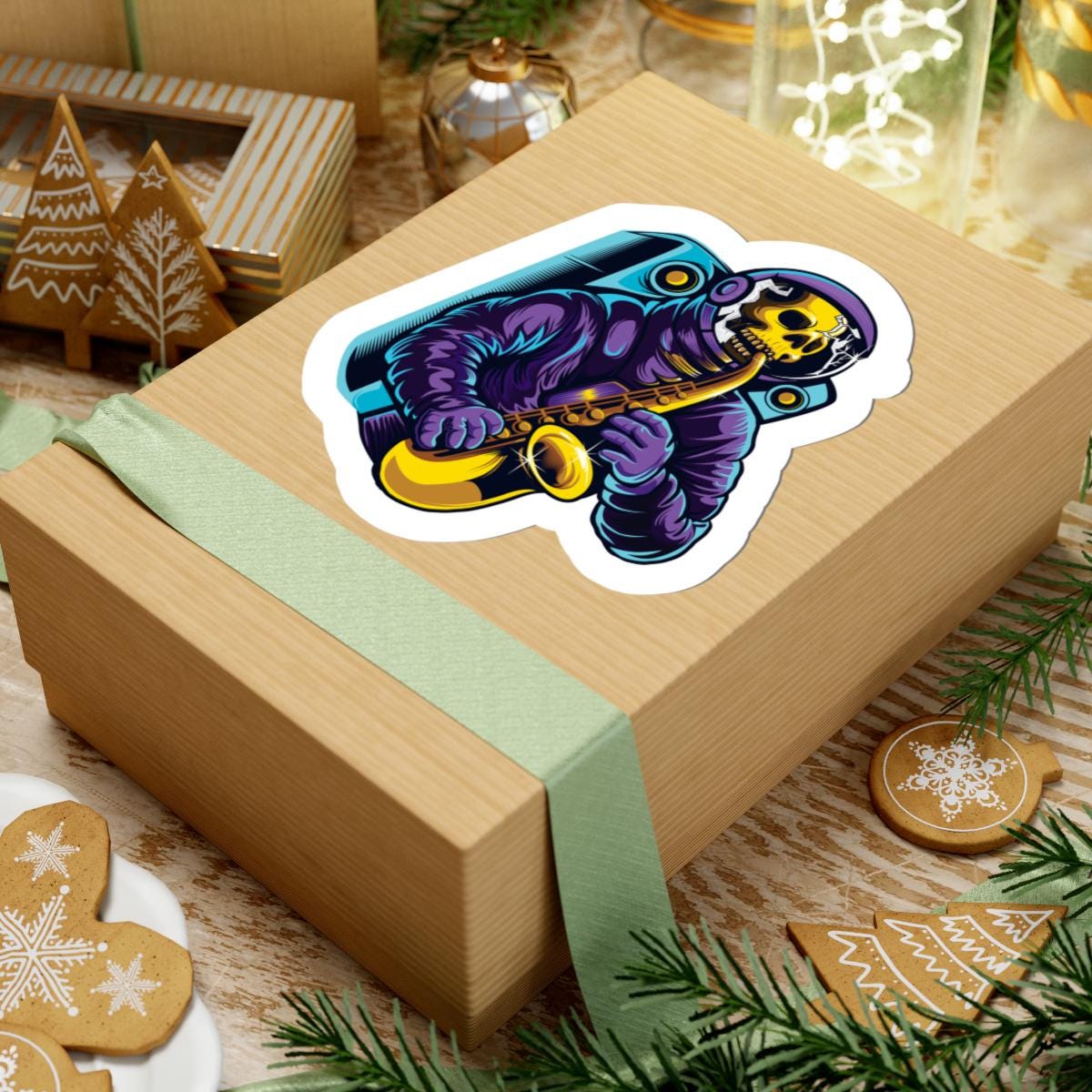 Add some sass and huBring a bold mix of cosmic vibes and musical flair to your collection with this Astroskull Saxophonist Sticker. Featuring a skull-headed astronaut playing a golden saxophone, this high-quality vinyl sticker is perfect for music lovers, jazz fans, and anyone who loves edgy, futuristic art.