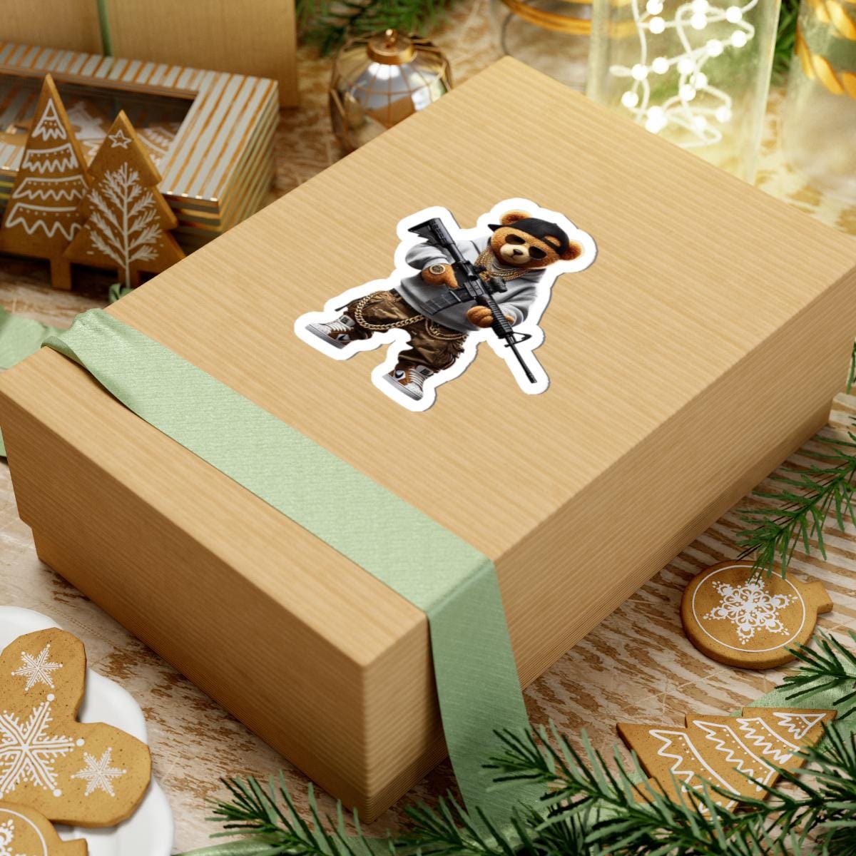 Bring bold attitude and unapologetic swagger to your gear with this Camo Gangsta Teddy Bear Kiss Cut Sticker. This iced-out bear rocks chunky gold chains, a gray hoodie, camo cargo pants, and a serious look while gripping an assault rifle. This fearless, street-style teddy makes a powerful impression whether you‘re decorating a laptop, skateboard, water bottle, or toolbox.
