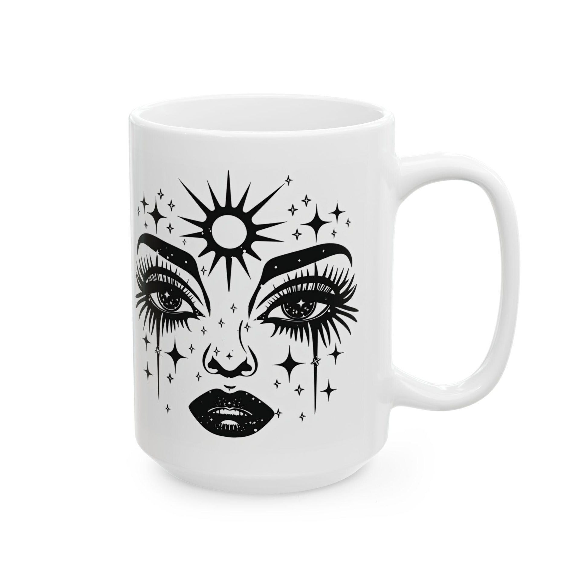 Awaken your cosmic energy with the ColorFlow | Celestial Goddess 15oz Ceramic Mug, a stunning fusion of divine femininity, astrology, and artistry. This captivating black-and-white design features a powerful celestial face adorned with radiant eyes, starlit tears, and a glowing sun — a symbol of strength, intuition, and the universe within.