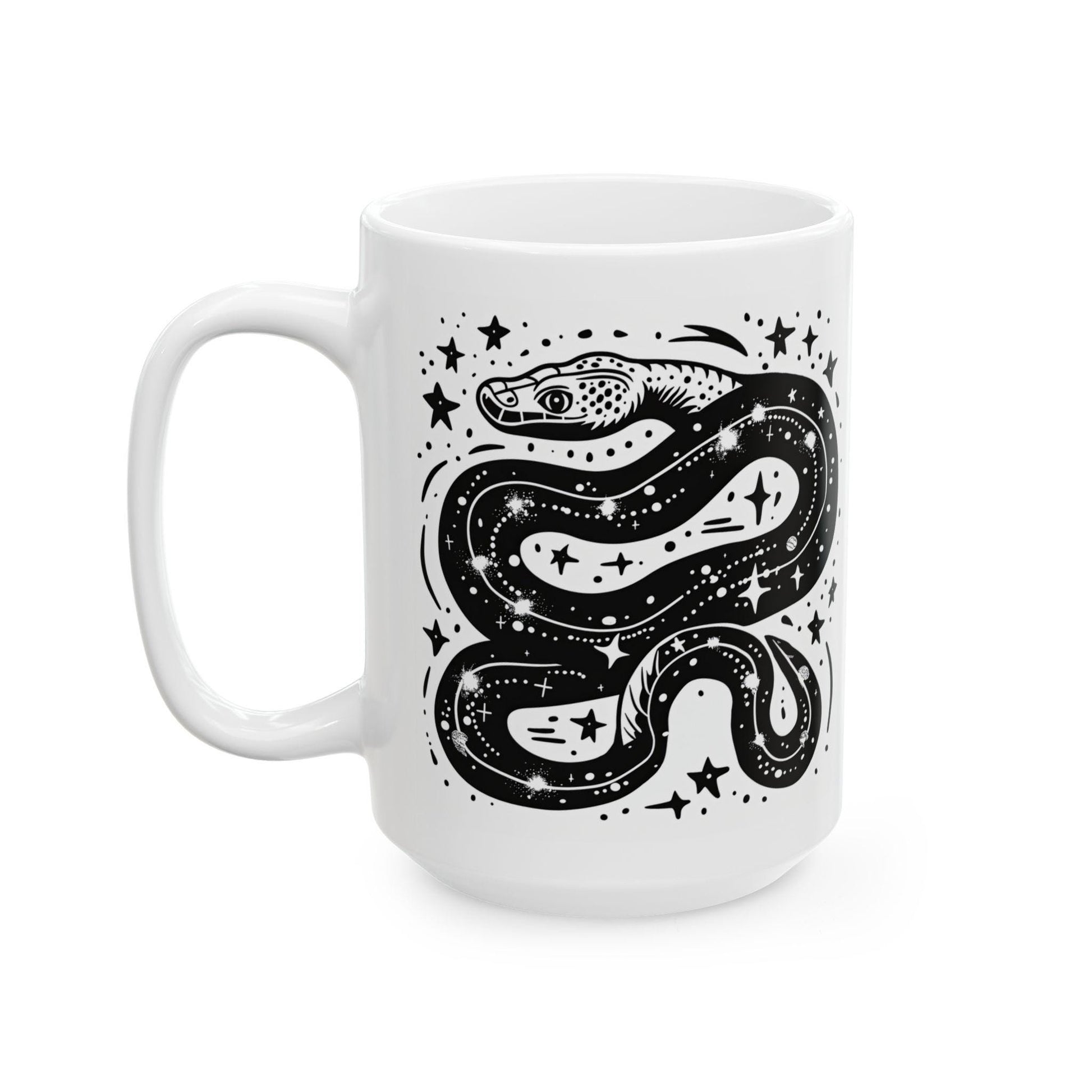 Channel cosmic energy with the ColorFlow | Celestial Serpent 15oz Ceramic Mug, a mesmerizing fusion of mysticism, transformation, and celestial beauty. This stunning black-and-white artwork features a serpent coiled through a sky of stars, symbolizing rebirth, strength, and infinite wisdom. Every sip invites you to embrace change and move boldly through life’s cosmic flow.