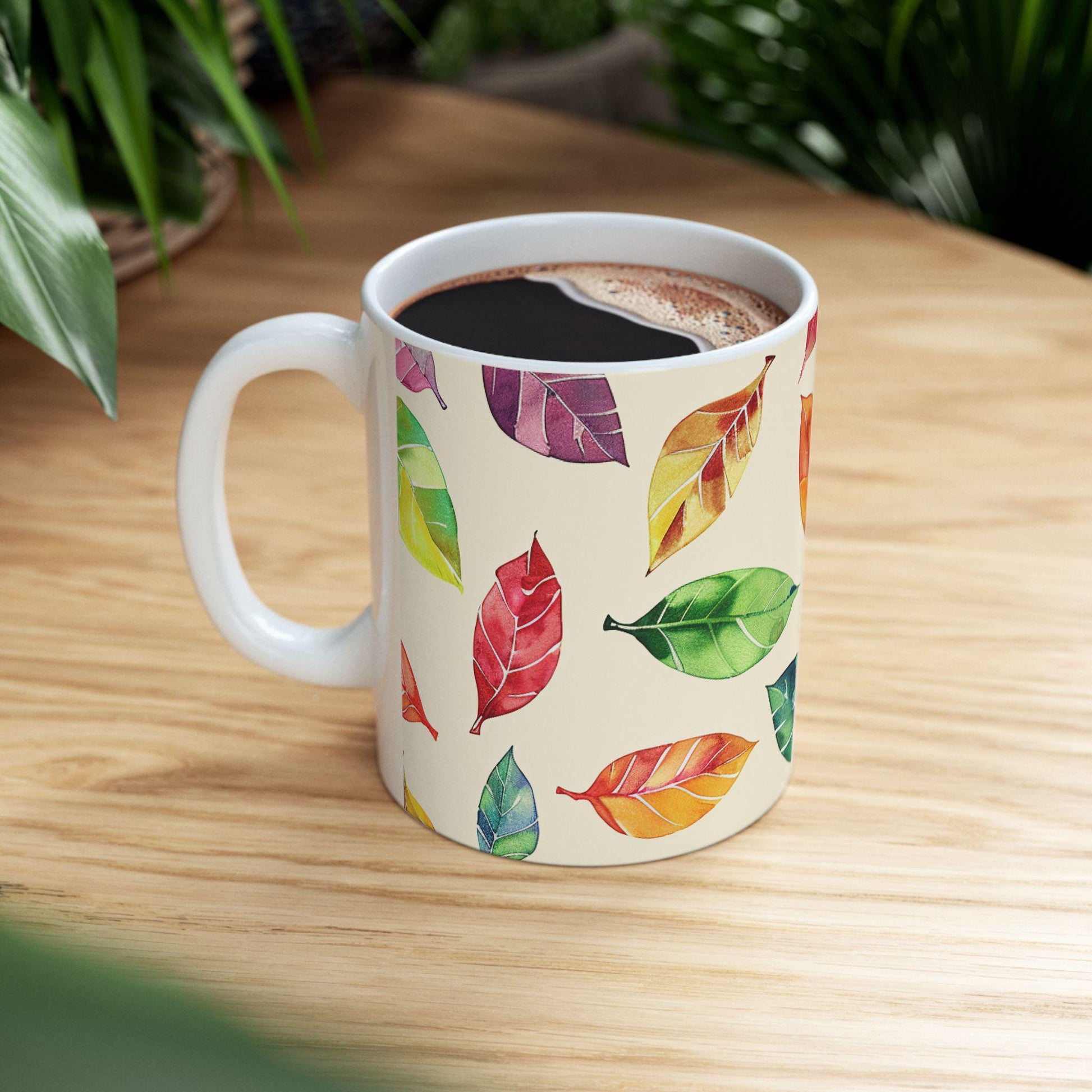 Celebrate the colors of fall with the ColorFlow Autumn Leaves Mug, a vibrant 15 oz ceramic coffee cup that brings the beauty of the season right to your morning routine. Featuring an elegant watercolor pattern of multicolored leaves in warm orange, red, green, and gold tones, this mug turns every sip into a cozy autumn moment.