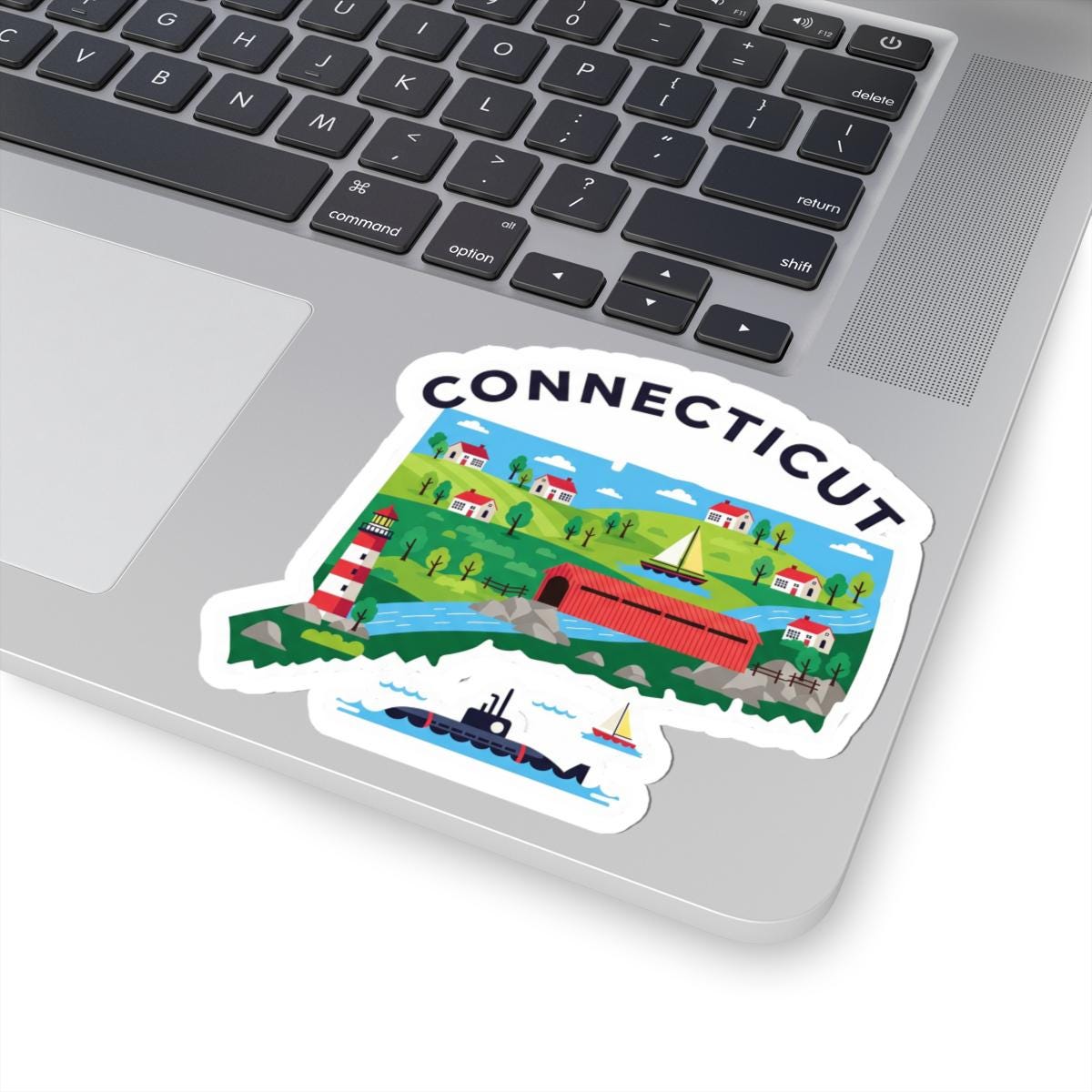 Show off your love for New England with this ColorFlow Connecticut Vinyl Sticker! Featuring the state’s iconic covered bridge, classic New England houses, a red and white lighthouse, sailboats, rolling green hills, and a submarine for Connecticut’s naval heritage. Made in the USA from 100% durable vinyl, this sticker is waterproof, weather-resistant, and built to last indoors or outdoors. Choose from six sizes and glossy, matte, or holographic finish. Ideal for laptops, water bottles, journals, car windows, and gifts for anyone who loves Connecticut charm!