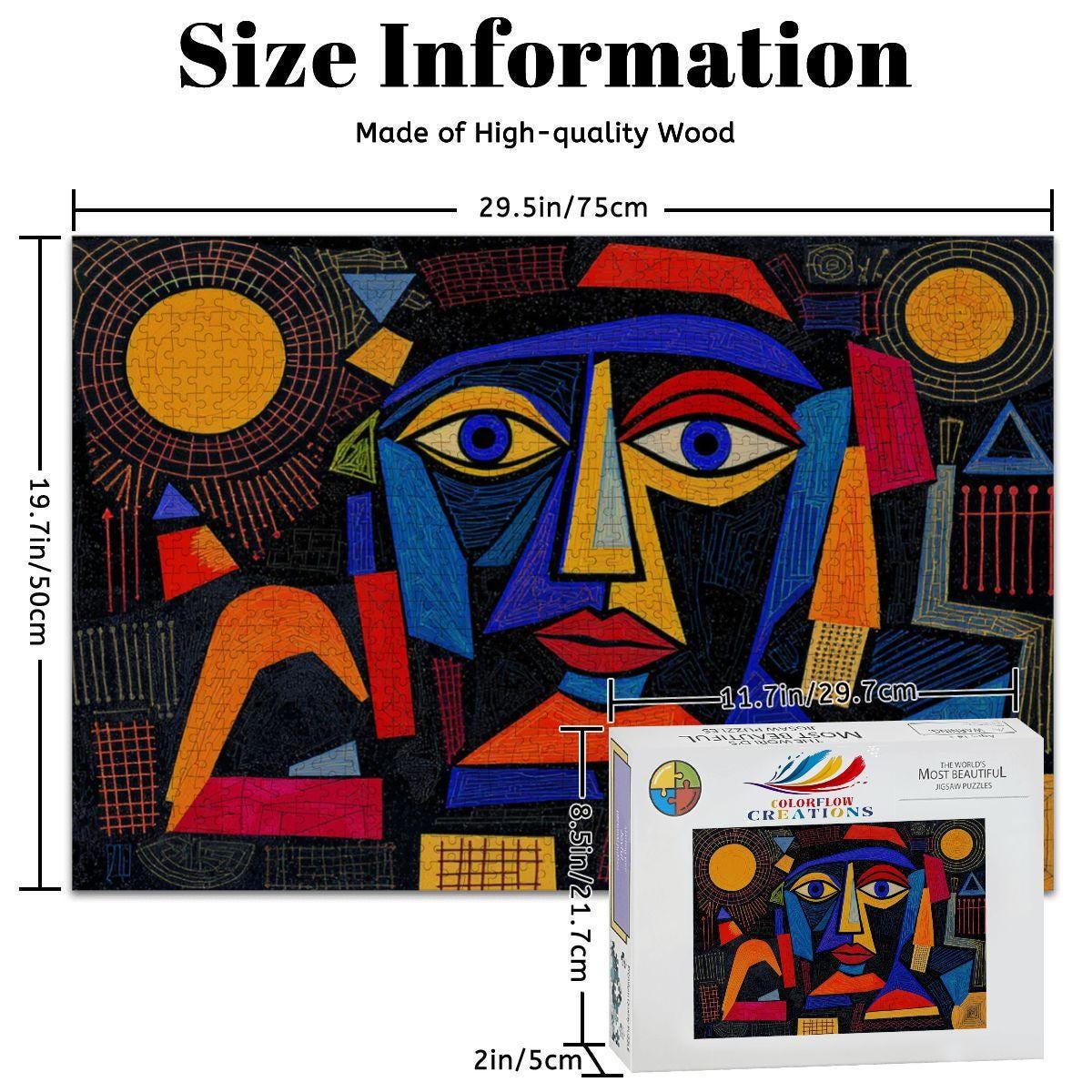Ignite your imagination with the ColorFlow Geometric Radiance Wooden Jigsaw Puzzle, inspired by the vibrant abstract style of Picasso. This dazzling puzzle features a bold, geometric face surrounded by radiant shapes and sun motifs, all set against a dramatic dark background. The striking palette of blues, reds, golds, and yellows turns every puzzle session into a creative adventure.