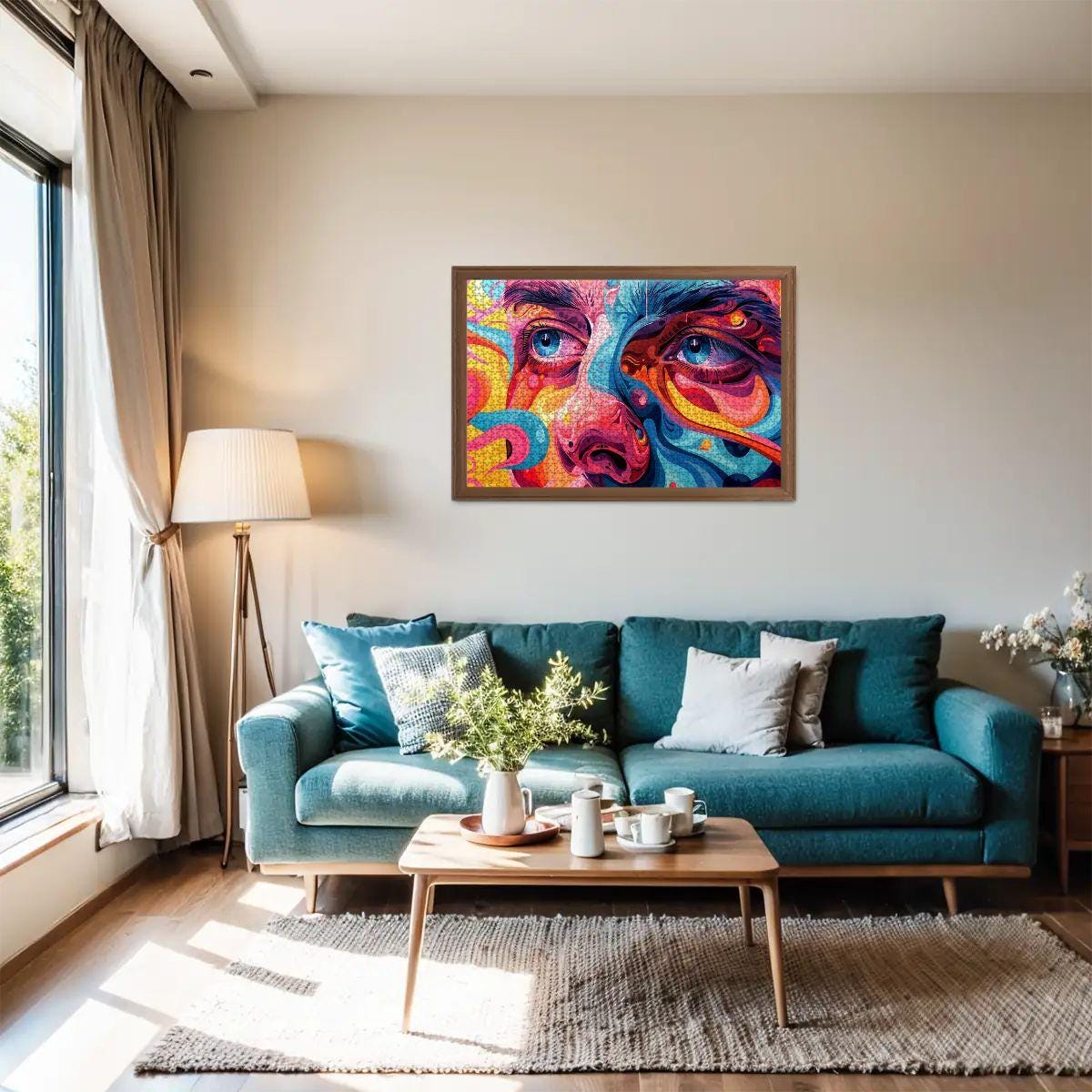Unlock the intensity of color and human emotion with the ColorFlow | Lucid Vision Wooden Puzzle, a striking psychedelic face puzzle available in 300, 500, and 1000 pieces. This bold abstract artwork features two vivid blue eyes emerging from a whirlwind of swirling color and stylized linework. Exploding with pinks, blues, reds, yellows, and oranges, every inch of this design pulses with creative energy.