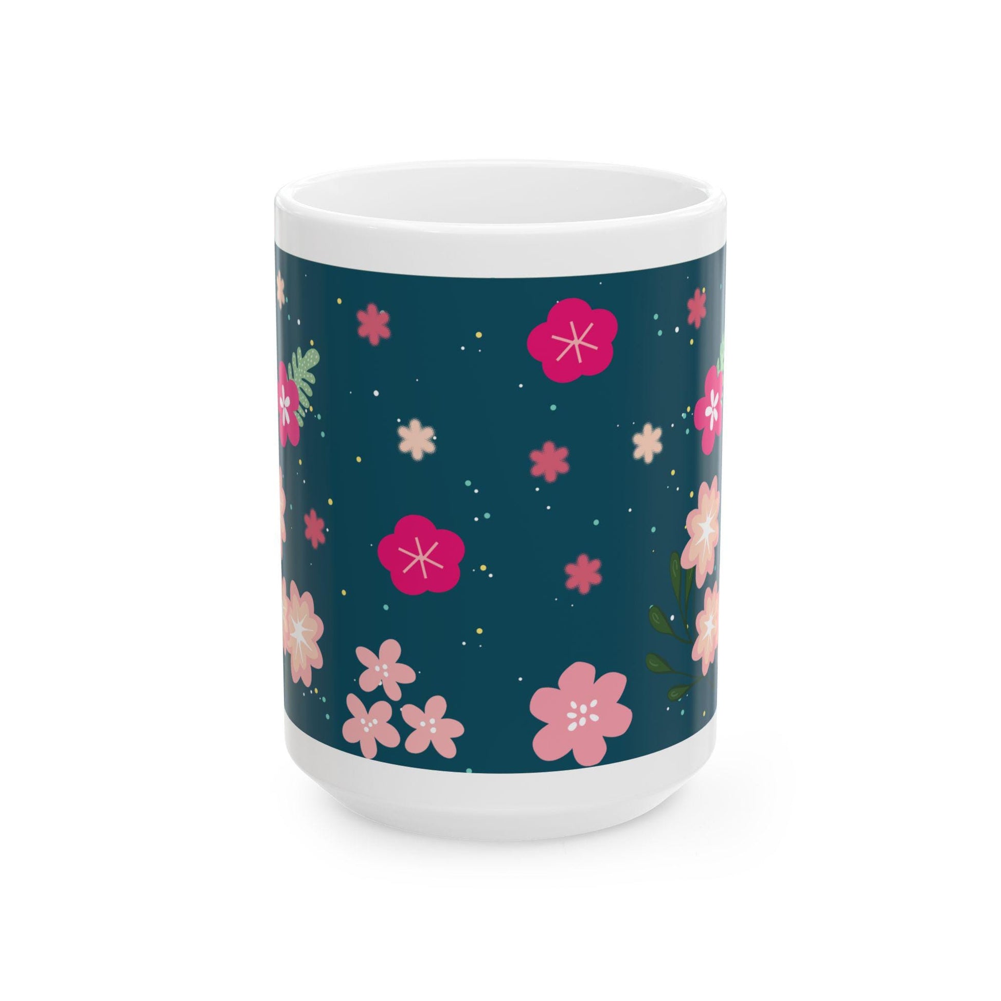 Bring bold elegance to your coffee routine with the ColorFlow Midnight Bloom Floral 15 oz Mug. This art-inspired ceramic mug features soft pink and magenta blossoms set against a deep teal background — a striking combination that adds a modern yet cozy charm to your morning ritual.