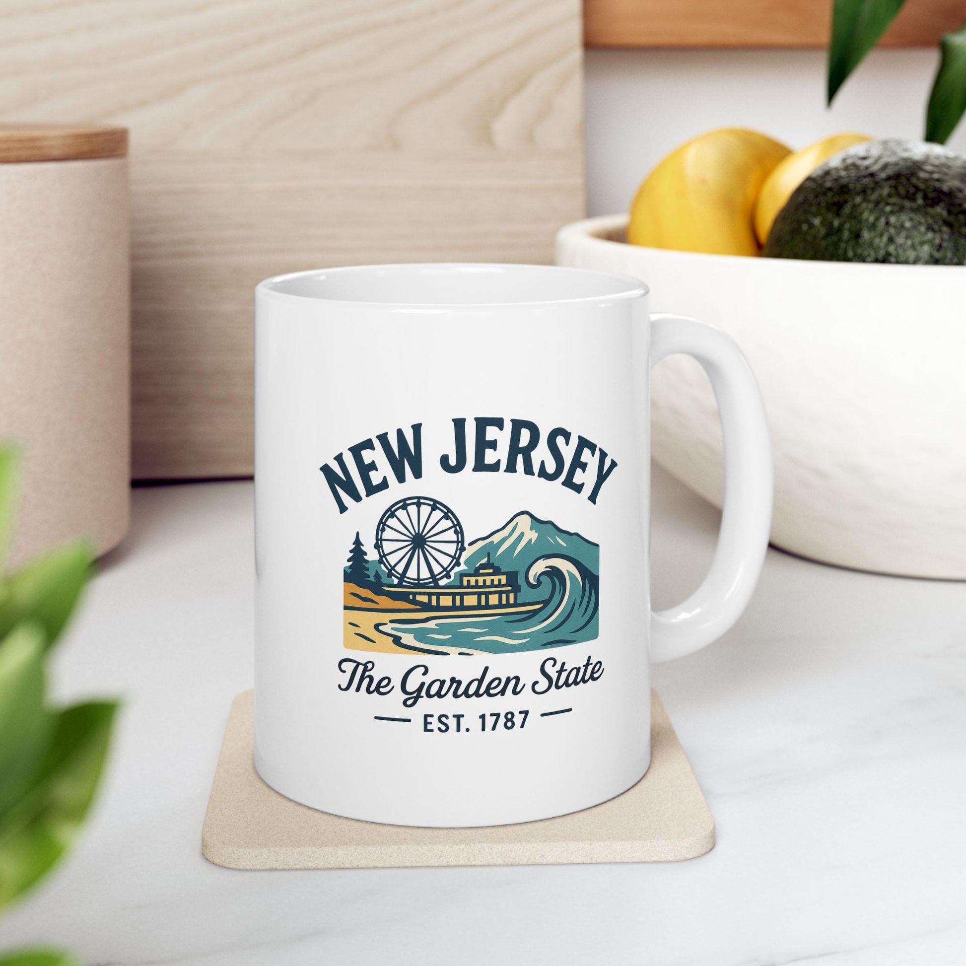 ColorFlow | New Jersey The Garden State Mug | 15oz Ceramic Coffee Cup | Boardwalk & Wave Design | Coastal Gift
