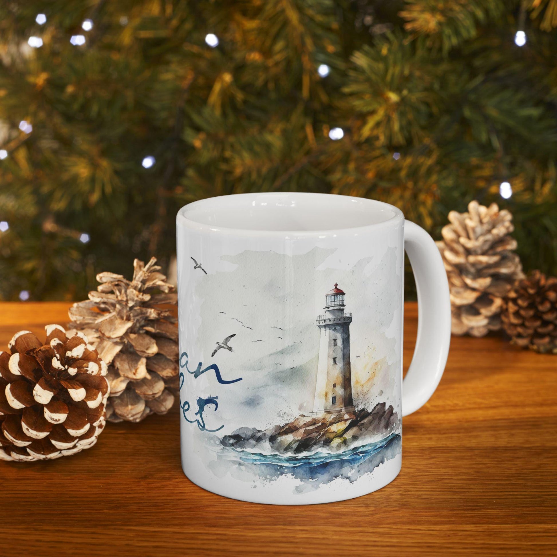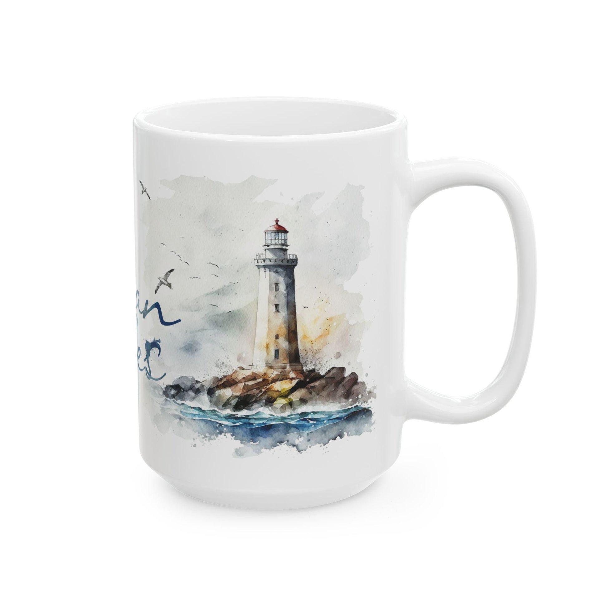 ColorFlow | Ocean Vibes Mug | Nautical Lighthouse 15oz Ceramic Coffee Cup | Beach Lover Gift with Coastal Art Design