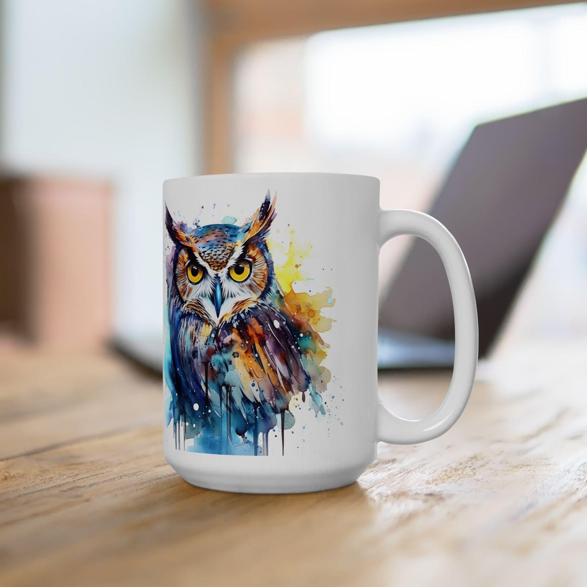 ColorFlow | Watercolor Owl Mug | Vibrant Abstract 15oz Ceramic Coffee Cup | Artistic Gift for Owl Lovers and Creatives