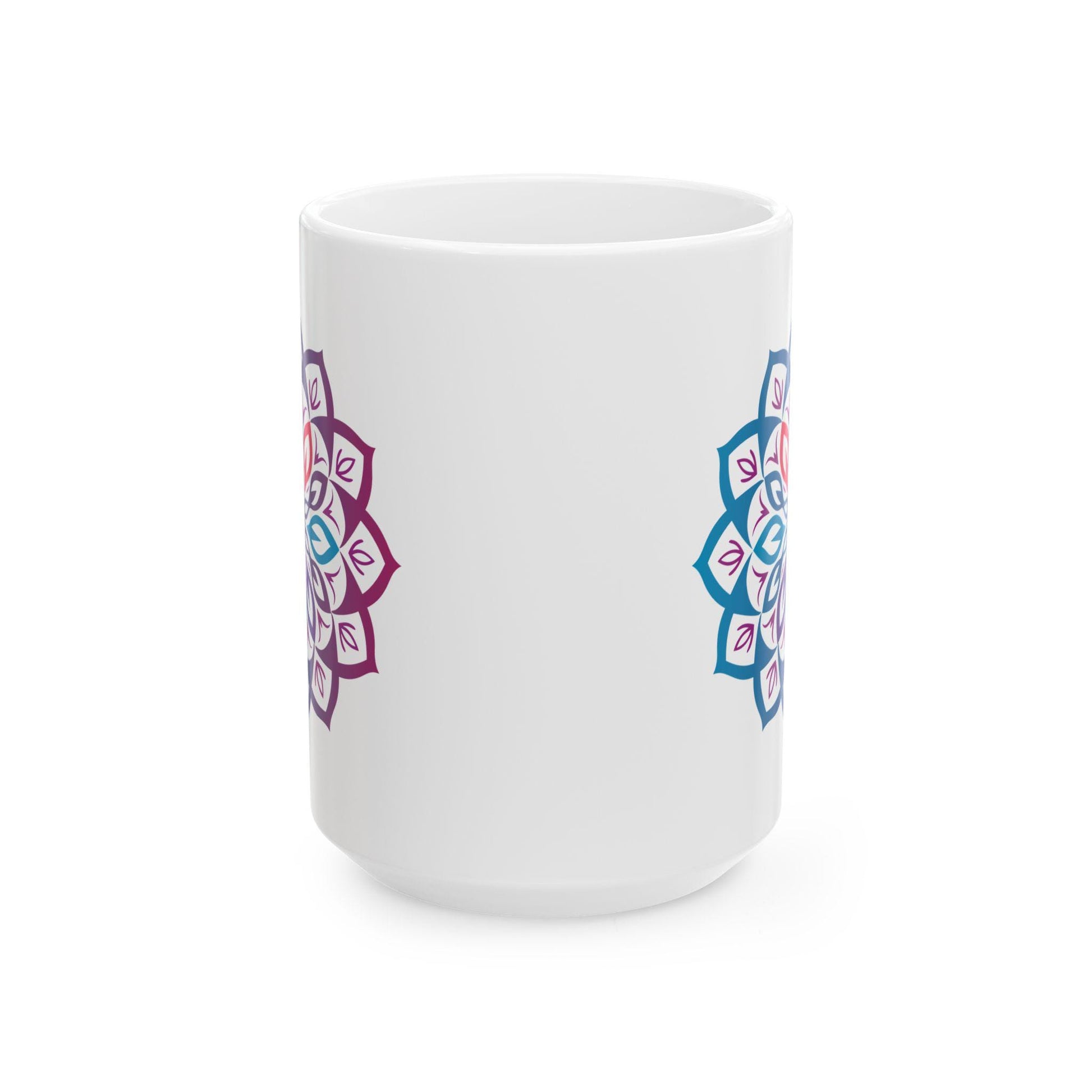 Each mug is artfully printed for lasting color and a glossy finish that enhances every delicate line of the mandala. Whether you’re savoring morning coffee, evening tea, or a cozy hot chocolate, this 15 oz mug offers the perfect mix of size and sophistication. Its ergonomic handle provides comfort with every sip, and it’s fully microwave and dishwasher safe, ensuring easy use and long-lasting quality.