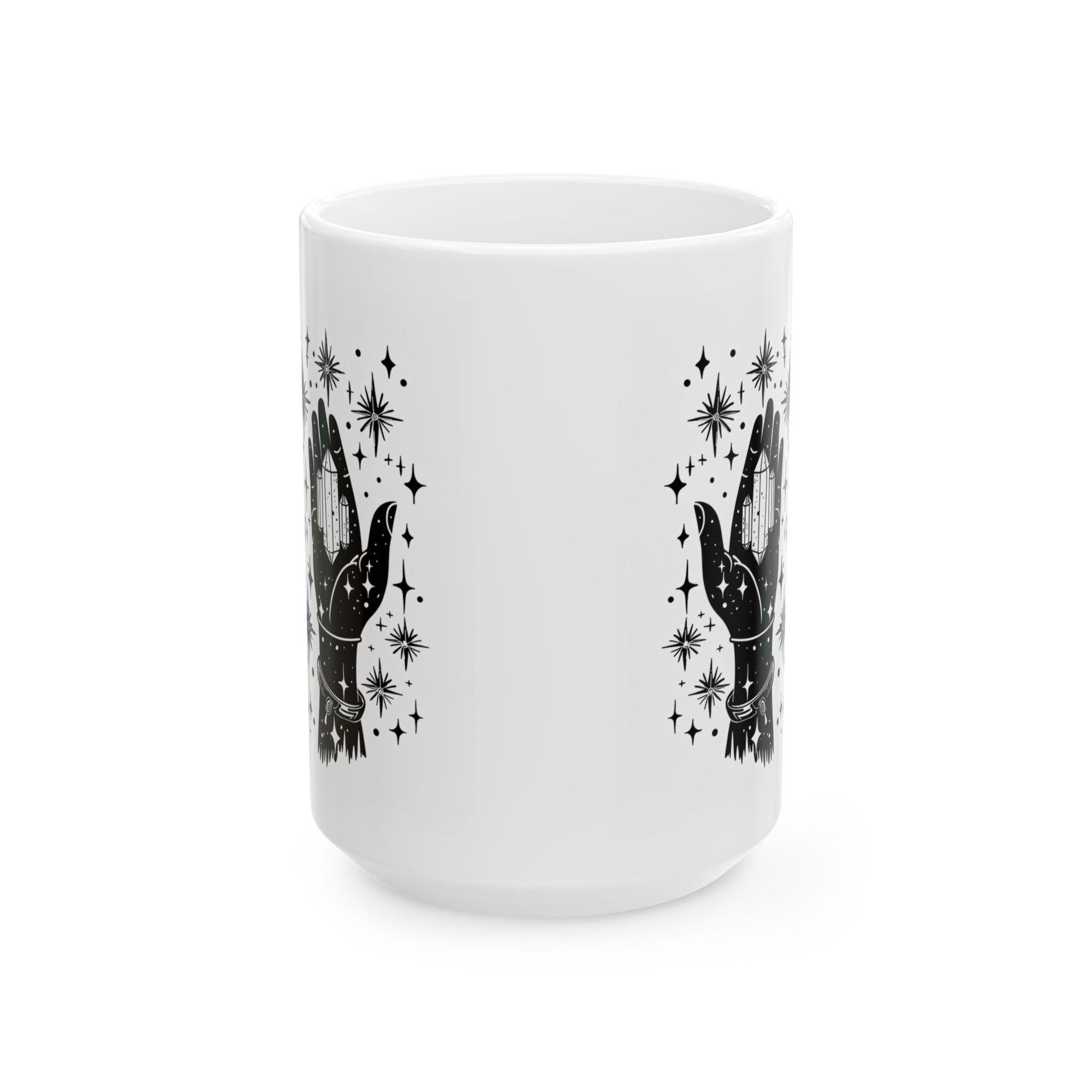 Step into the cosmic energy of your morning routine with the ColorFlow | Mystical Crystal Hands 15oz Ceramic Mug — where art, magic, and mindfulness meet. Featuring a striking black-and-white celestial design of open hands cradling radiant crystals surrounded by starlight, this mug adds a touch of mystic beauty to every sip.