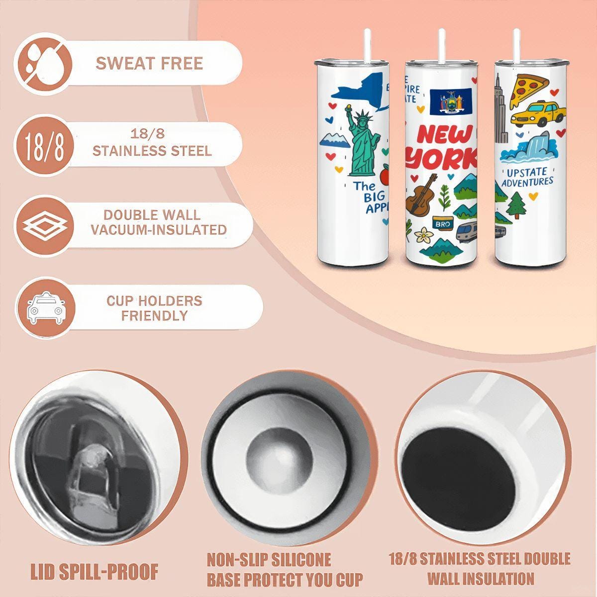 , a vibrant art-inspired tribute to one of the world’s most iconic places. Featuring colorful illustrations of New York’s landmarks — the Statue of Liberty, Empire State Building, yellow cab, pizza slice, and upstate mountains — this tumbler captures the perfect balance of city energy and natural escape.