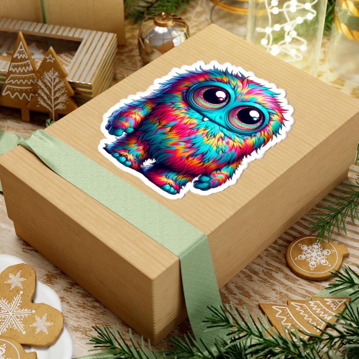 Brighten your world with the ColorFlow Rainbow Fuzzy Big-Eyed Monster Kiss Cut Sticker. This cheerful design features a fluffy rainbow-colored monster with oversized sparkling eyes, a teal-blue face, and an adorable expression. Perfect for lovers of colorful art, kawaii-style characters, and unique collectible stickers.