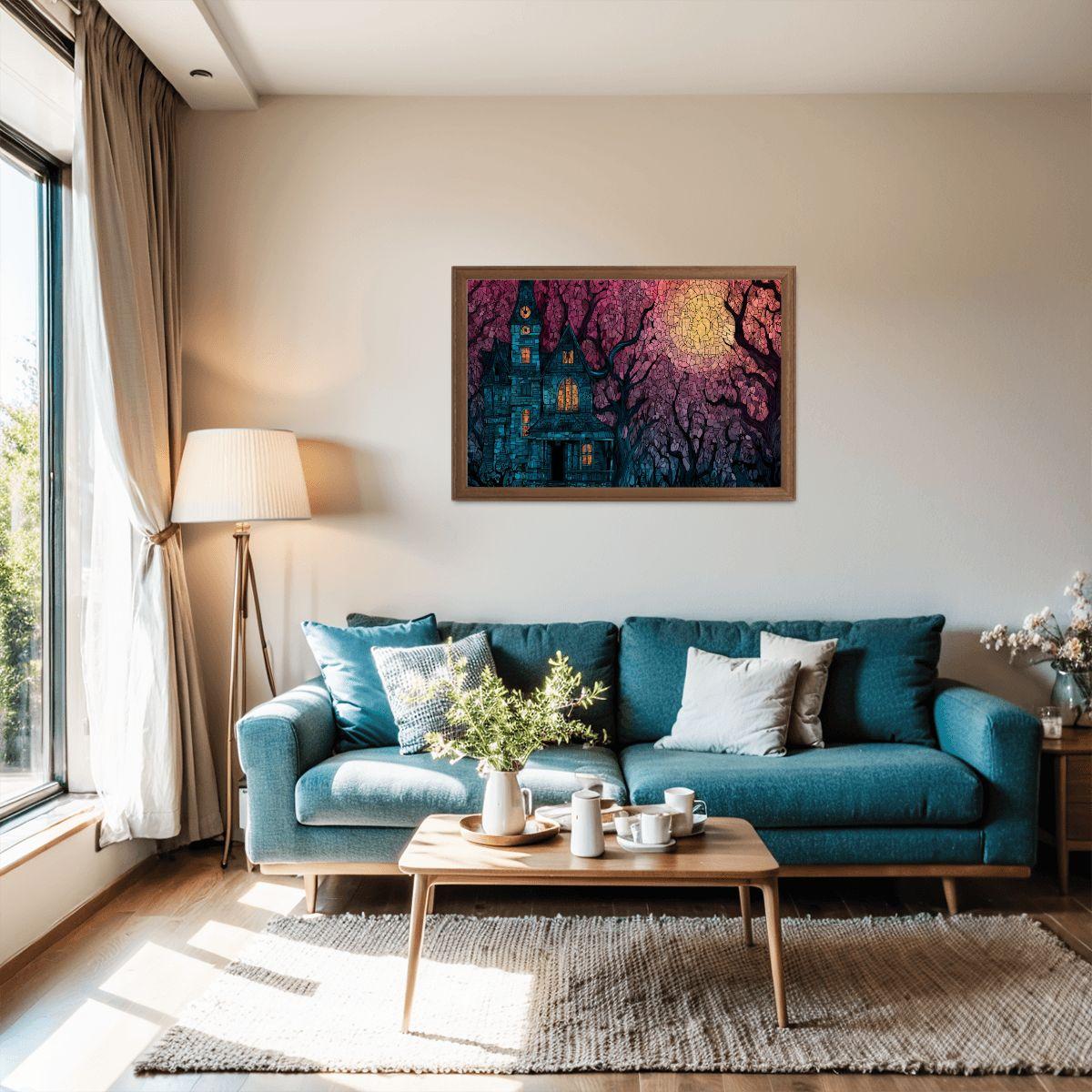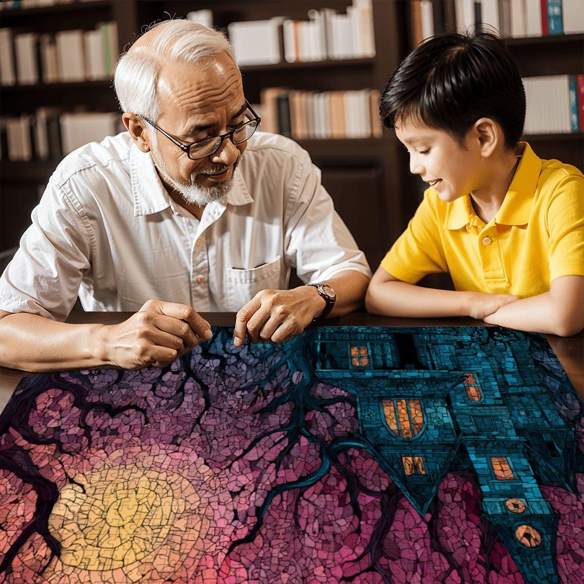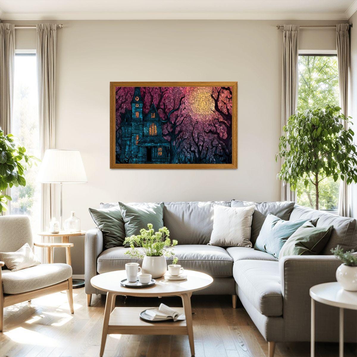 Step into a twisted fairytale with this hauntingly beautiful Wooden Jigsaw Puzzle featuring a gothic-style haunted house surrounded by eerie trees and glowing moonlight—all captured in a stunning stained-glass mosaic style.