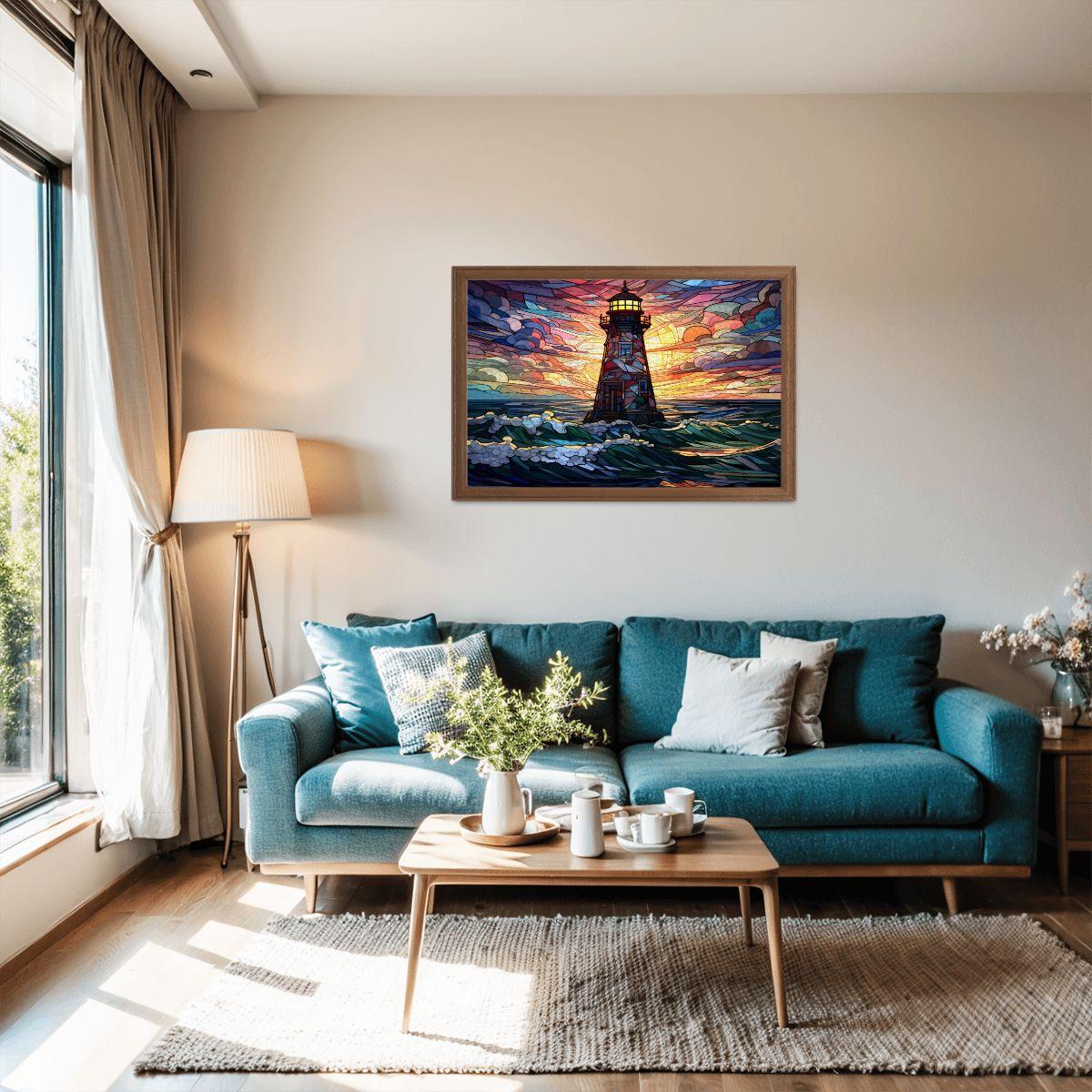 Stained Glass Lighthouse Puzzle: Multicolor Sunset Ocean Art,